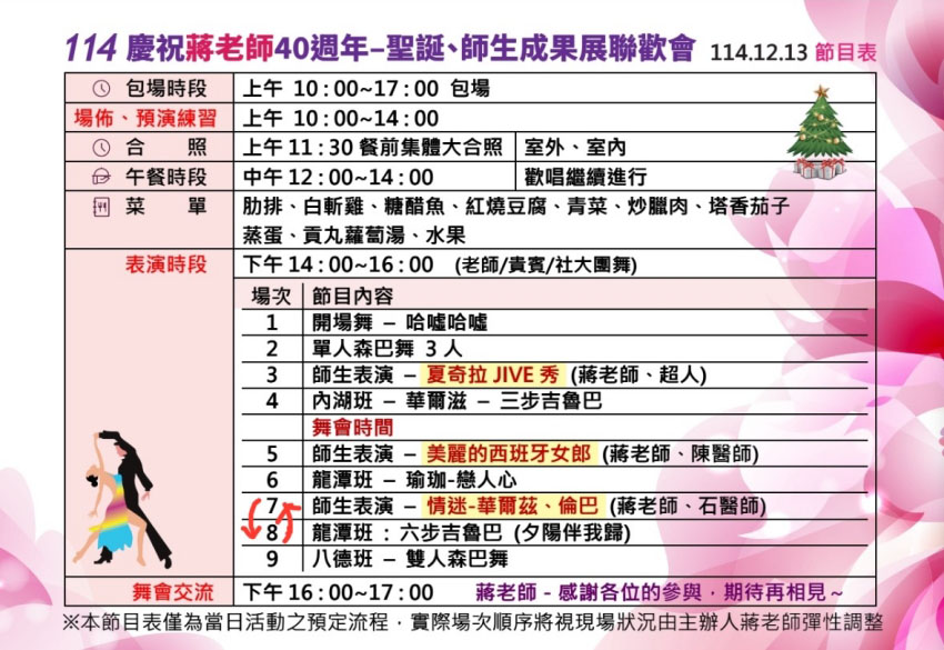 服務介紹 聯歡會 114年慶祝蔣老師40週年聖誕、師生成果展聯歡會 114年慶祝蔣老師40週年聖誕、師生成果展聯歡會 活動內容影片 1 開場舞 哈噓哈噓 2 單人森巴舞 3-1 師生表演 夏奇拉JIVE秀蔣老師、超人 3-2 師生表演 夏奇拉JIVE秀蔣老師、超人 3-3 師生表演 夏奇拉JIVE秀蔣老師、超人 4-1 內湖華爾滋 三步吉魯巴 4-2 內湖班 華爾滋 三步吉魯巴 5 師生表演 美麗的西班牙女郎 6 龍潭班 六步吉魯巴夕陽伴我歸 7 師生表演 情迷 華爾滋、倫巴蔣老師、石醫師 8 八德班 雙人森巴舞 活動剪影 114年慶祝蔣老師40週年聖誕、師生成果展聯歡會